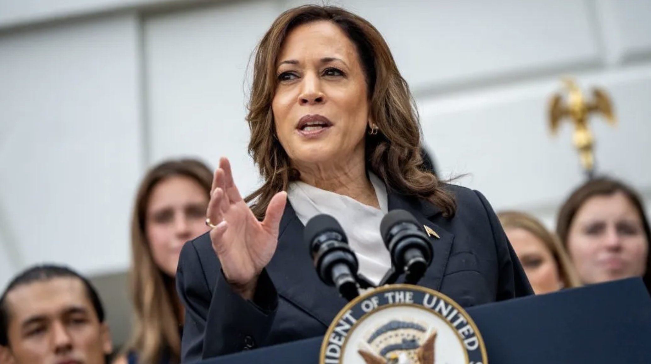 U.S. Vice President Kamala Harris speaks during an NCAA championship teams celebration on the South Lawn of the White House on July 22, 2024, in Washington, D.C. (Photo by Andrew Harnik/Getty Images)